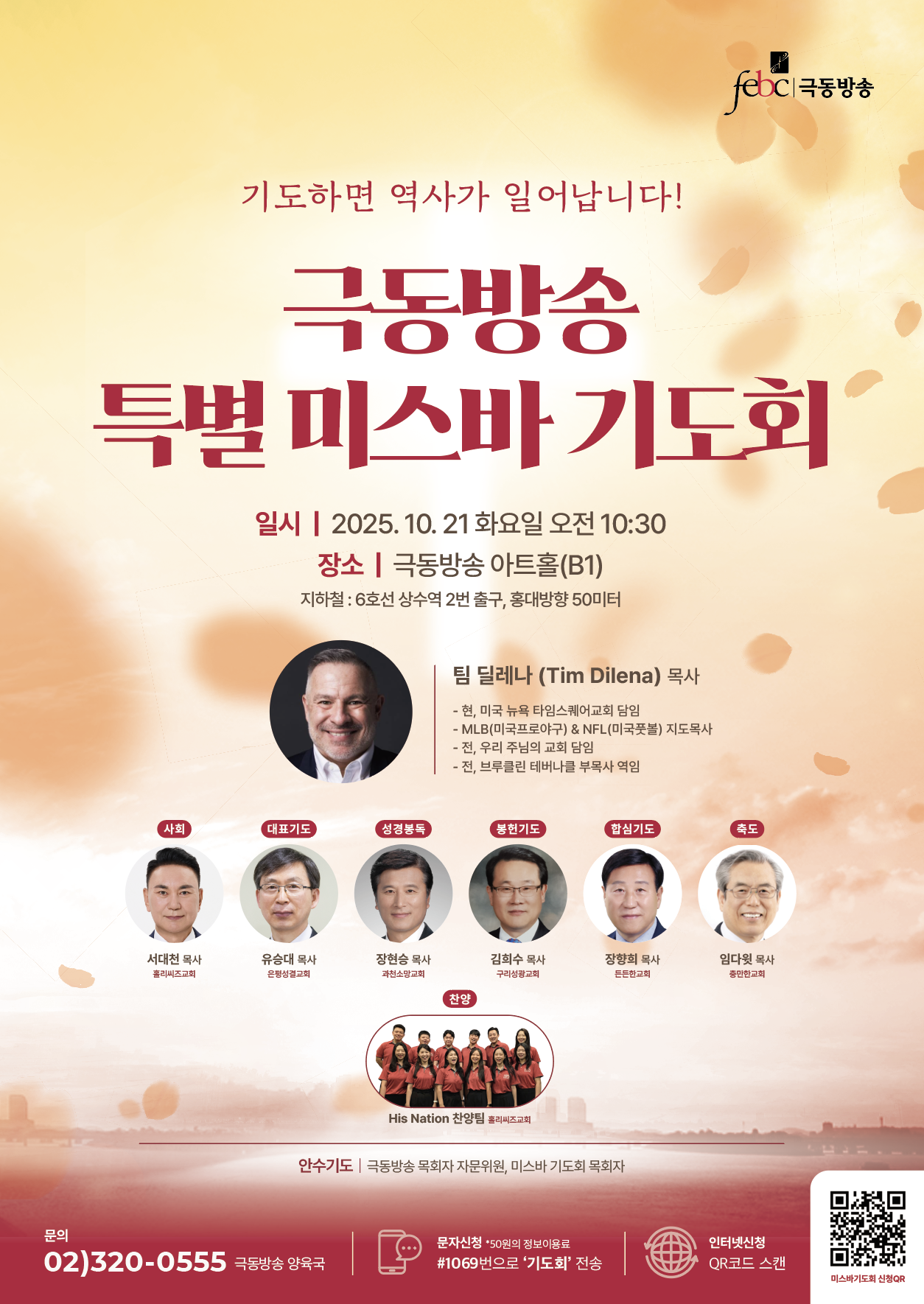 극동방송 특별 미스바기도회 - 일시: 10월 21일(화) 오전 10:30- 오후 12:20 (오전 10시부터 입장) - 말씀: 팀 딜레나 (Tim Dilena) 목사 (미국 뉴욕 타임스퀘어교회 담임) - 찬양: His Nation 찬양팀 - 장소: 극동방송 지하1층 아트홀 (마포구 와우산로 56, 4시간 무료 주차) / 지하철 6호선 상수역 2번 출구, 홍대방향 도보 5분